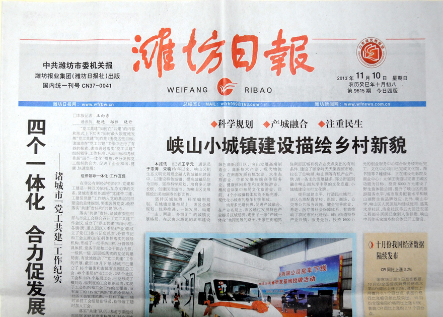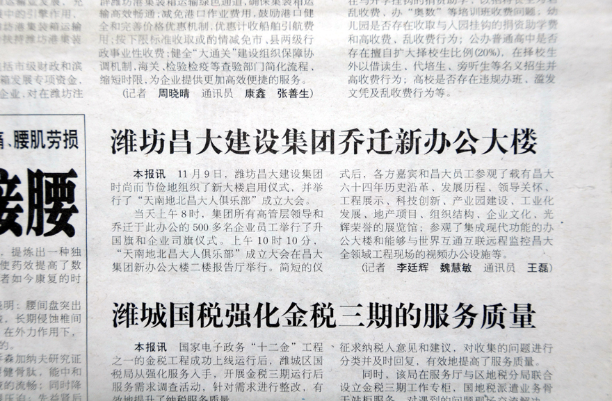 2013年11月09日,集團(tuán)喬遷至高新區(qū)健康東街6999號(hào),濰坊日?qǐng)?bào)、濰坊晚報(bào)刊登集團(tuán)喬遷慶典的報(bào)道。