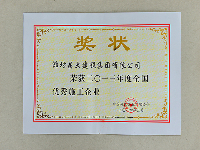 2014年4月18日,中國(guó)施工企業(yè)管理協(xié)會(huì)第29次年會(huì)暨2014年中國(guó)施工裝備展覽洽商會(huì)在南京召開。會(huì)上,對(duì)2013年度全國(guó)優(yōu)秀施工企業(yè)進(jìn)行了表彰(人民日?qǐng)?bào)第24008期公示)。集團(tuán)公司榮獲2013年度全國(guó)優(yōu)秀施工企業(yè)稱號(hào)。