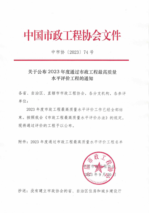 2023年9月20日,中國市政工程協(xié)會(huì)公布通過2023年度市政工程最高質(zhì)量水平評(píng)價(jià)工程名單(中市協(xié)〔2023〕74號(hào)),集團(tuán)公司承建的寶通街快速路工程(一標(biāo)段)獲此殊榮,這是濰坊市首個(gè)市政工程最高質(zhì)量水平評(píng)價(jià)工程,也是集團(tuán)公司多年來又一市政行業(yè)質(zhì)量最高獎(jiǎng)。