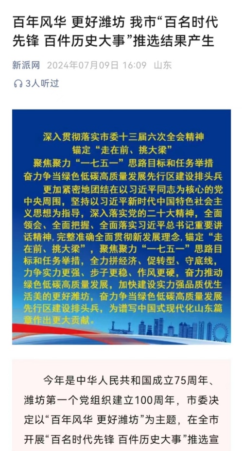 近日,由濰坊市委決定以“百年風(fēng)華、更好濰坊”為主題,在全市開展的“百名時(shí)代先鋒、百件歷史大事”推選宣傳活動(dòng),經(jīng)過廣泛征求各方面意見、組織推薦、投票推選等,“雙百”推選結(jié)果產(chǎn)生。