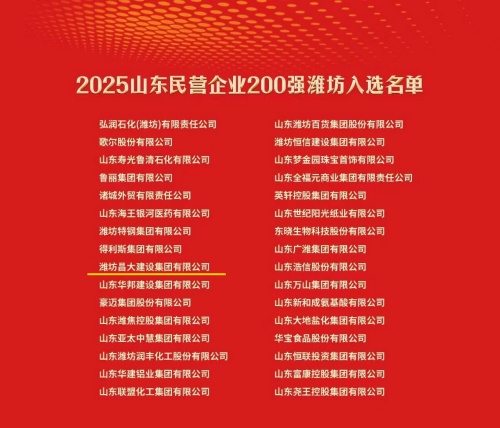 會(huì)上,昌大建設(shè)集團(tuán)憑借穩(wěn)健的發(fā)展、突出的行業(yè)貢獻(xiàn)及良好的社會(huì)口碑,不僅入選2025濰坊市50強(qiáng)企業(yè)名單,還連續(xù)榮獲2025山東民營(yíng)企業(yè)200強(qiáng)等多項(xiàng)省級(jí)榮譽(yù)。同時(shí)集團(tuán)所屬泰和置業(yè)有限公司還獲得2025山東民營(yíng)企業(yè)服務(wù)業(yè)100強(qiáng)等省級(jí)榮譽(yù),充分彰顯了集團(tuán)作為濰坊建筑業(yè)領(lǐng)軍企業(yè)的實(shí)力、地位和作用。